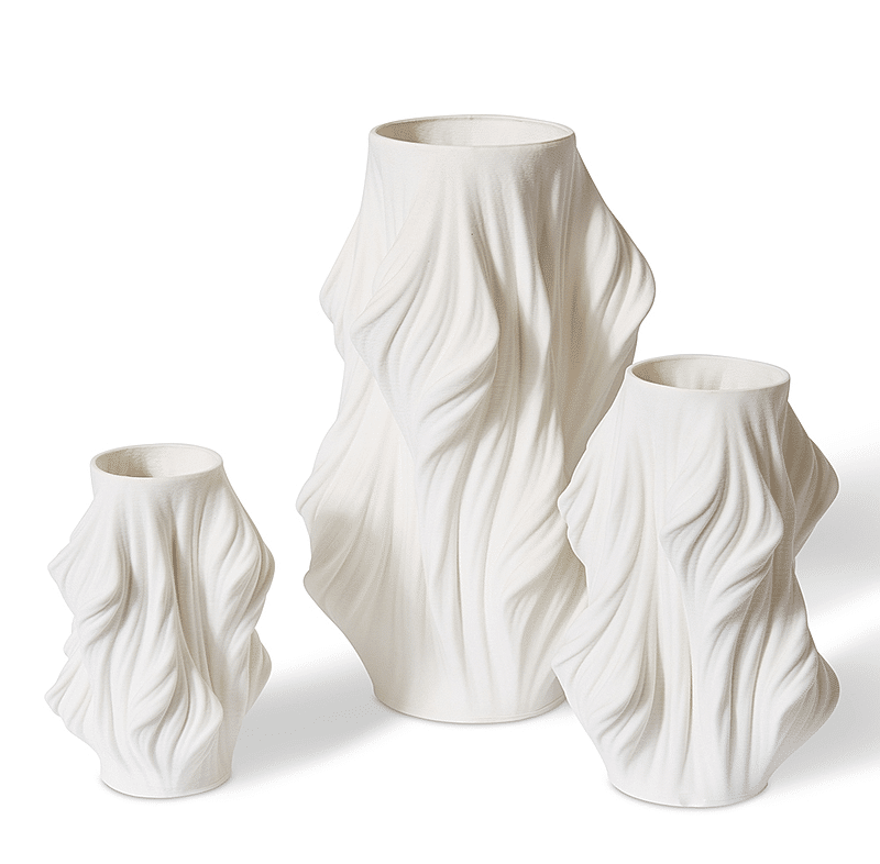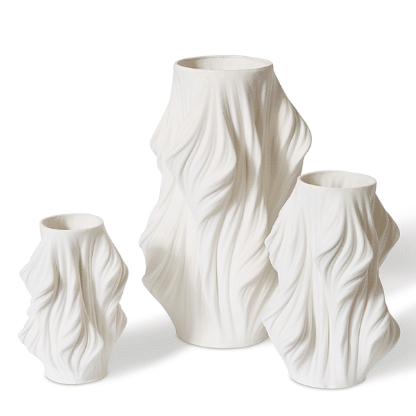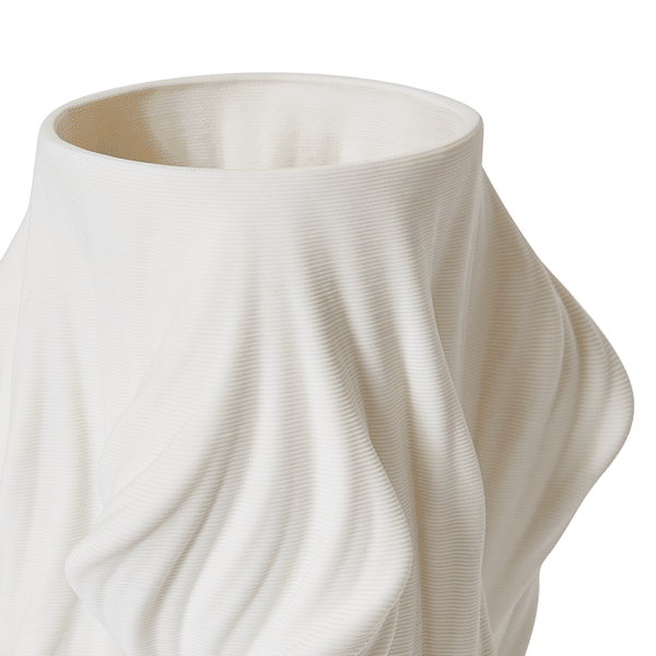 Išskirtinio dizaino vaza. Jos paviršiuje subtiliai vingiuojančios linijos sukuriamos į judesio ir lengvumo įspūdį, suteikdamos interjerui modernios prabangos akcentą. Matinė balta spalva pabrėžia minimalistinį dizainą ir leidžia lengvai derėti tiek šiuolaikiškuose, tiek klasikiniuose namuose.