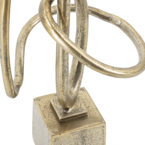 Moderni ir elegantiška interjero detalė, kuri akimirksniu suteiks erdvei išskirtinumo. Ši abstrakti metalinė skulptūra pasižymi subtiliomis, tarpusavyje persipinančiomis linijomis, kuriančiomis judesio ir balanso įspūdį. Aukso spalvos paviršius atspindi šviesą, todėl dekoracija tampa išraiškingu akcentu tiek dieną, tiek vakare.