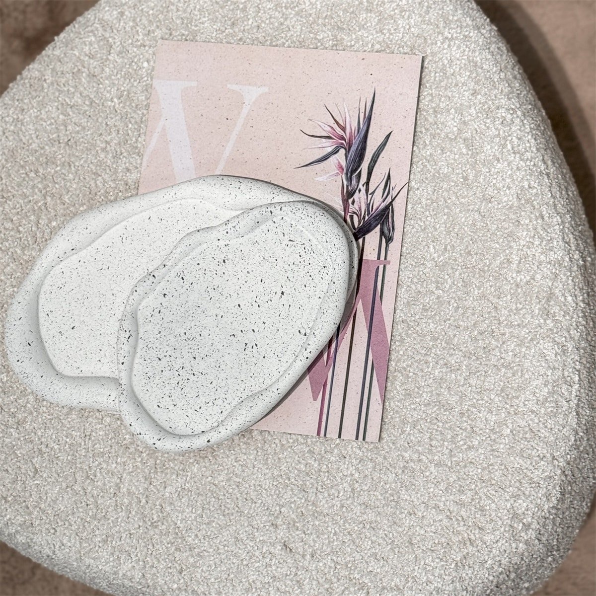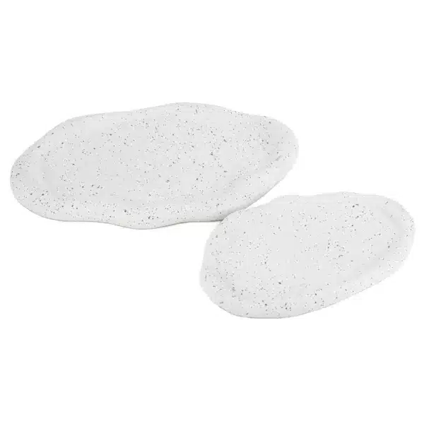 Minimalistinio dizaino, organiškos formos keramikiniai padėkliukai gali būti naudojamas ir serviravimui, ir dekoravimui. Nereiklūs interjerui, galima derinti su tos pačios kolekcijos  indu nat kojelių. Tiks ir vonios kambaryje, ir ant valgomo stalo, ar ant miegamojo komodos.