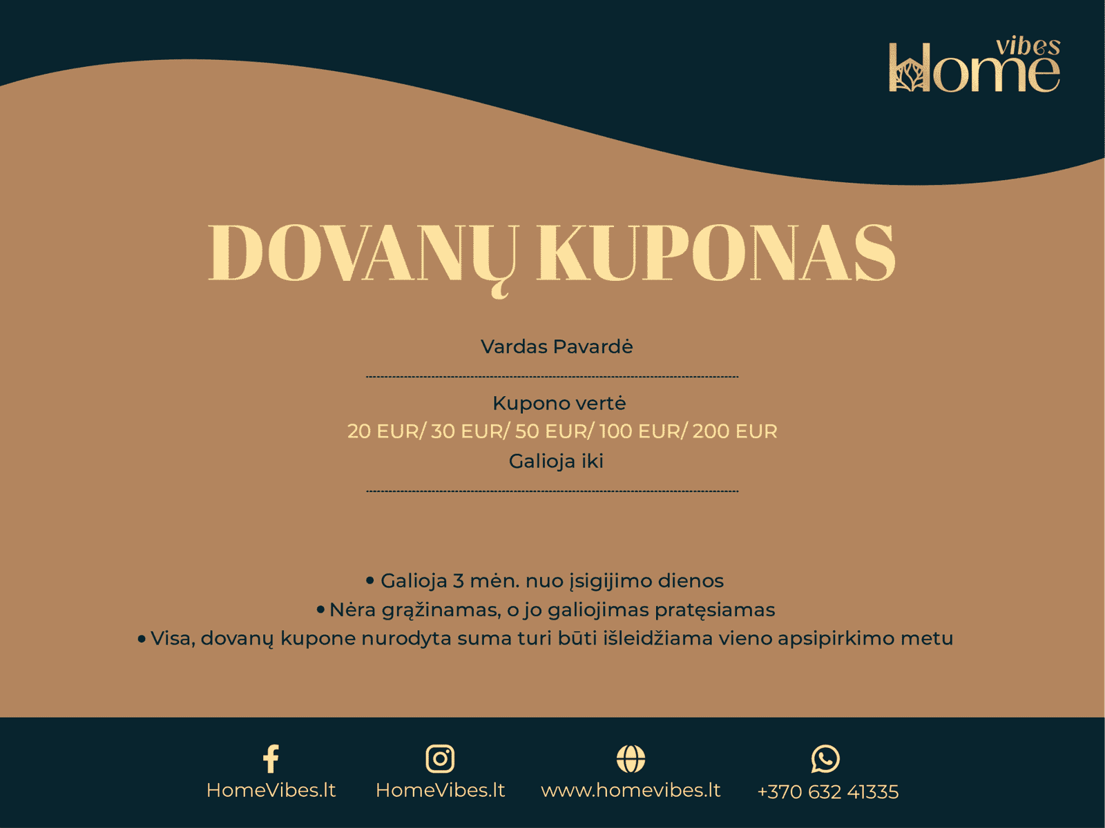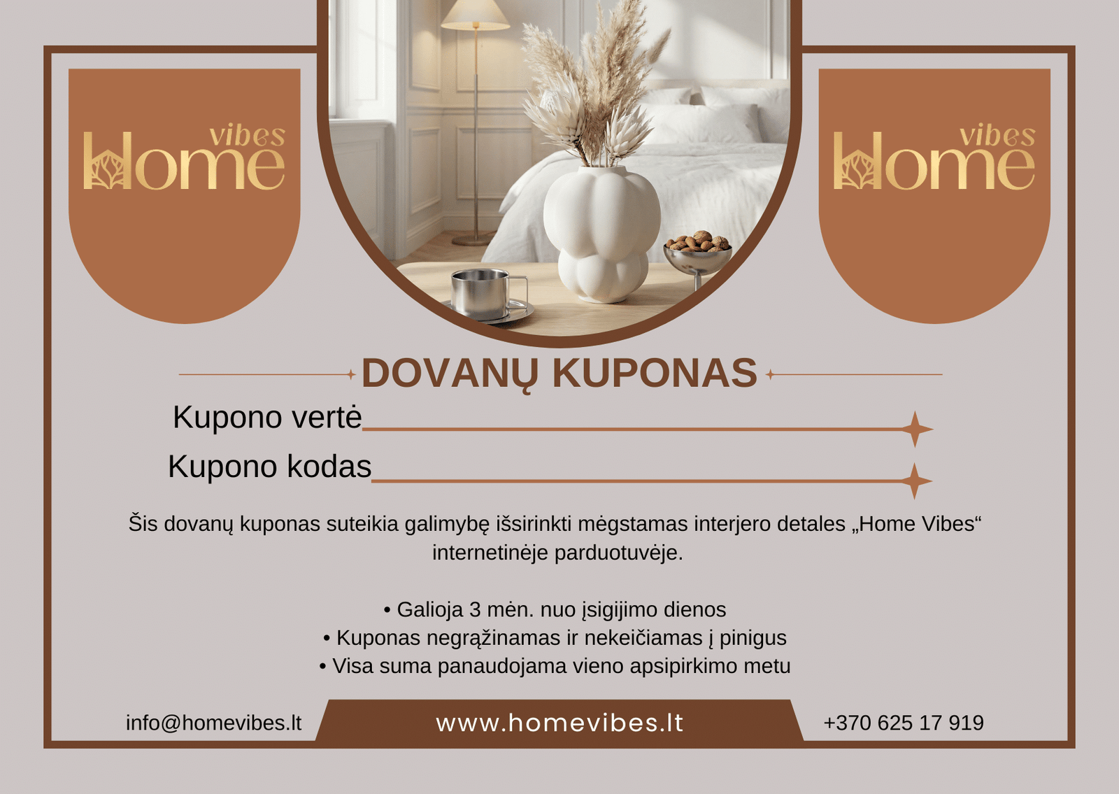 Tačiau mes turime Jums pasiūlymą – el. parduotuvės HomeVibes dovanų kuponas! Pasirinkę jį dovanoti tikrai būsite garantuoti, jog gavėjo išsirinkta dovana iš mūsų asortimento tiks, patiks ir turės vietą jo namuose, ar kitoje jam svarbioje aplinkoje.