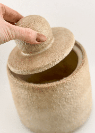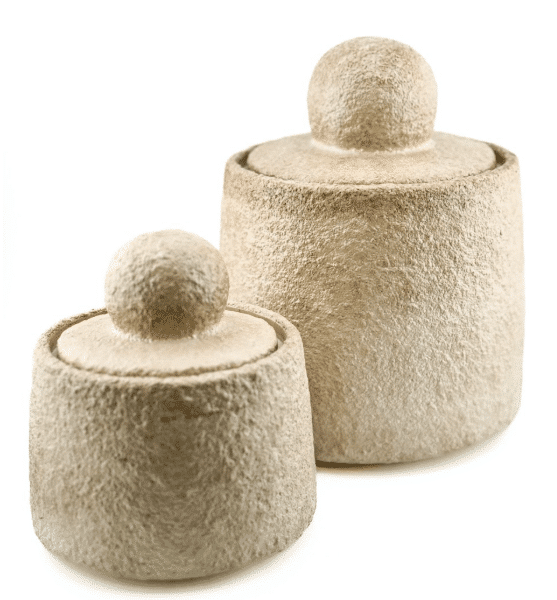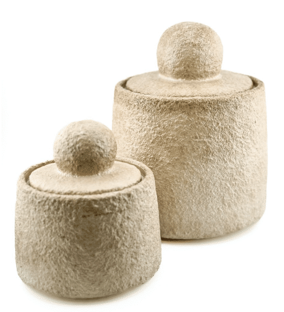 Dekoratyviniai indai su dangteliais, pagaminti iš natūralios tekstūros medžiagos, šviesaus smėlio atspalvio. Jų minimalistinė, cilindro forma ir apvalūs dangtelių laikikliai suteikia jiems skulptūriškumo bei natūralumo pojūtį.