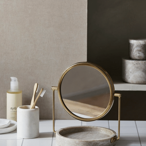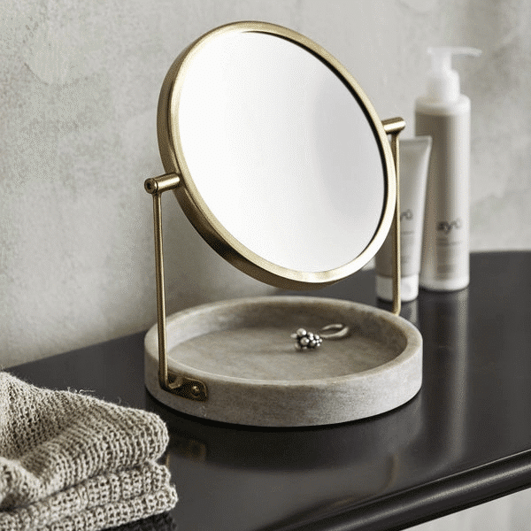 Veidrodis su auksiniais kraštais ir šviesiai rudo marmuro lėkštele.