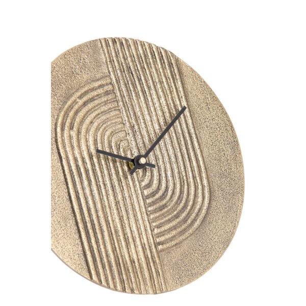 Šis išskirtinio dizaino stalinis laikrodis – tai subtilus meno ir funkcionalumo derinys. Jo apvali forma ir reljefinis paviršius sukuria dinamišką, banguojančią tekstūrą, kuri traukia akį ir suteikia interjerui charakterio.