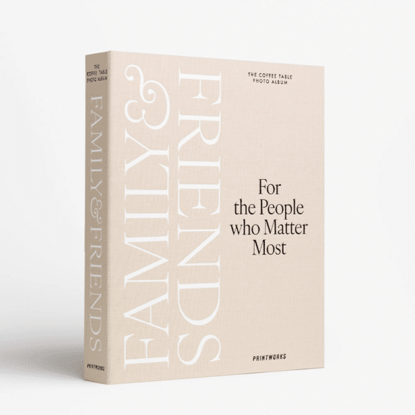 Atraskite savo kavos staliuko nuotraukų albumą „FAMILY AND FRIENDS“ su minkštu, elegantiškos smėlio spalvos audinio viršeliu.