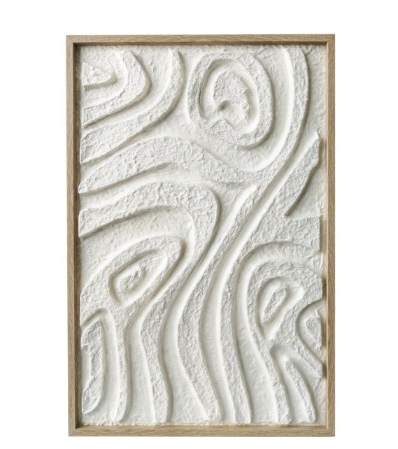 Natūralaus medžio rėmas kontrastuoja su baltumu ir suteikia visumai šilumos bei jaukumo. Tai modernus, minimalistinis meno kūrinys, kuris į interjerą įneša ramybės, natūralumo ir subtilios, organiškos dinamikos.