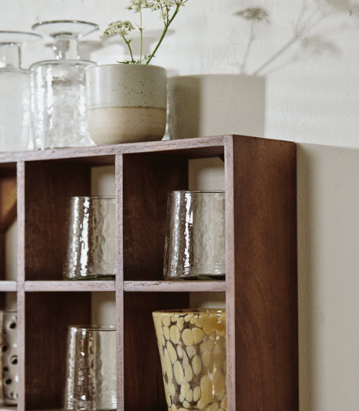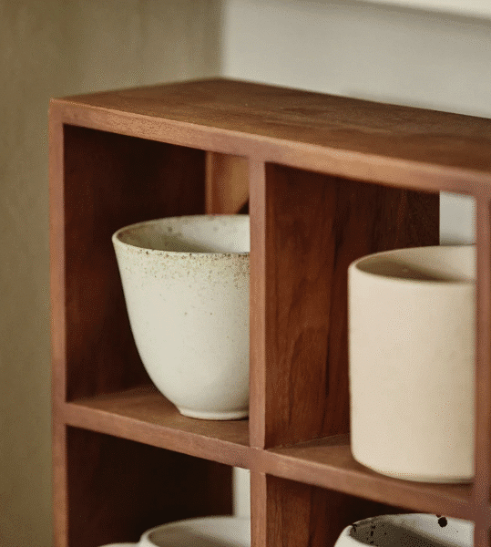 Sukurkite tobulą savo mėgstamiausių keraminių puodelių ekspoziciją su OSSA puodelių lentyna iš mango medienos.