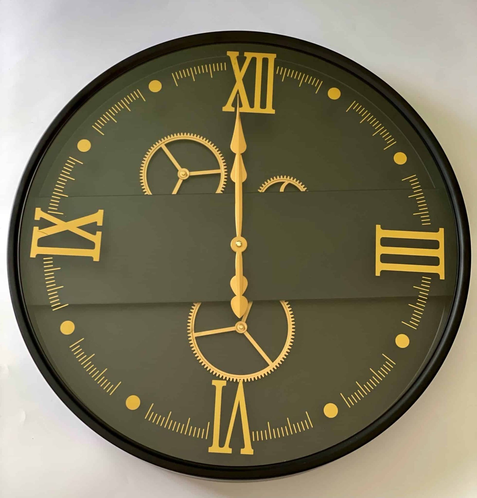 Sieninis laikrodis „Modern” – moderni, praktiška ir stilinga namų interjero detalė! Laikrodis pagamintas iš juodos spalvos metalo, su žalvario/sendinto aukso spalvos detalėmis. Dengtas stiklu.