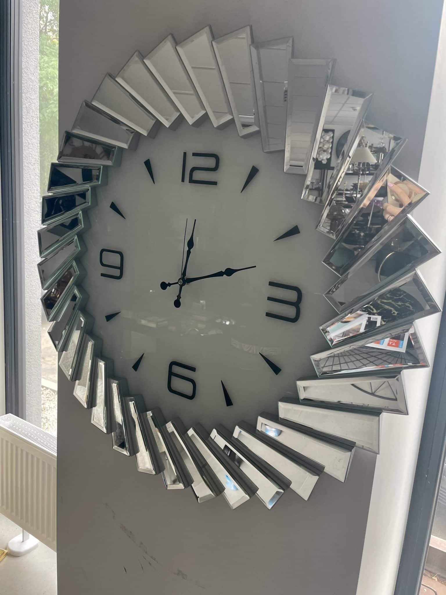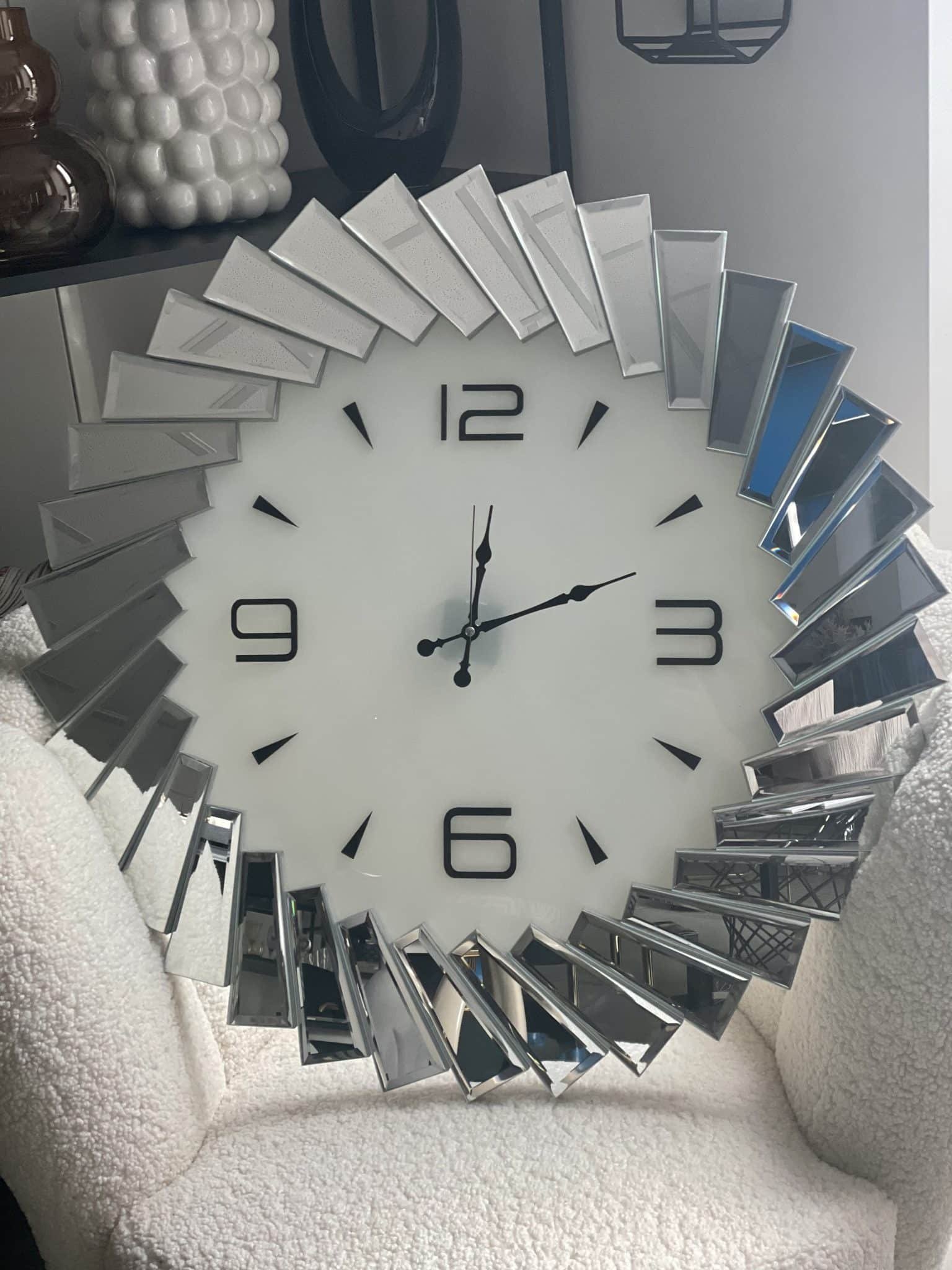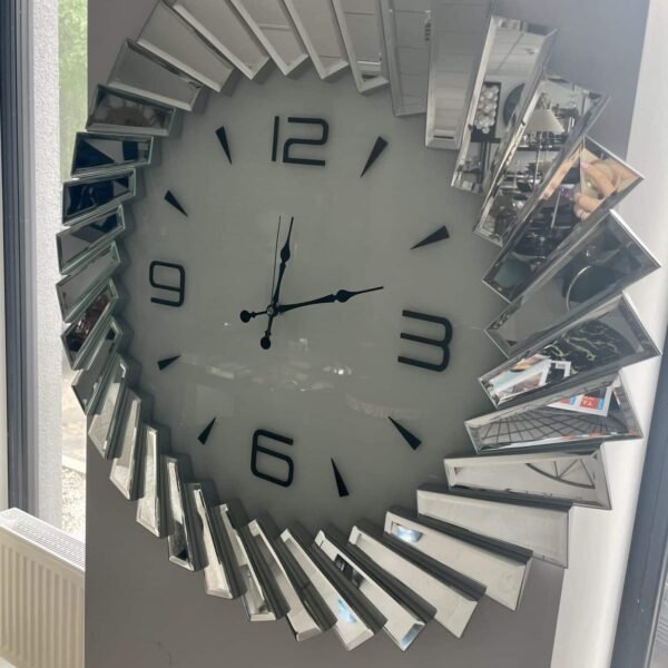 Sieninis laikrodis “SILVER” – praktiška ir labai stilinga namų interjero detalė! Laikrodis yra pagamintas iš veidrodžio ir stiklo, su juodos spalvos detalėmis. Šis laikrodis yra didelis, tvirtas savo forma, tačiau kartu interjere atrodo kaip lengvas, gaivus ir labai žavus aksesuaras. Laikrodis tikrai neliks nepastebėtas Jūsų interjere!