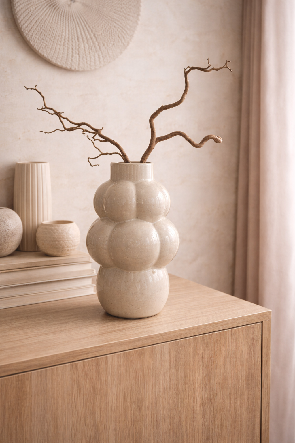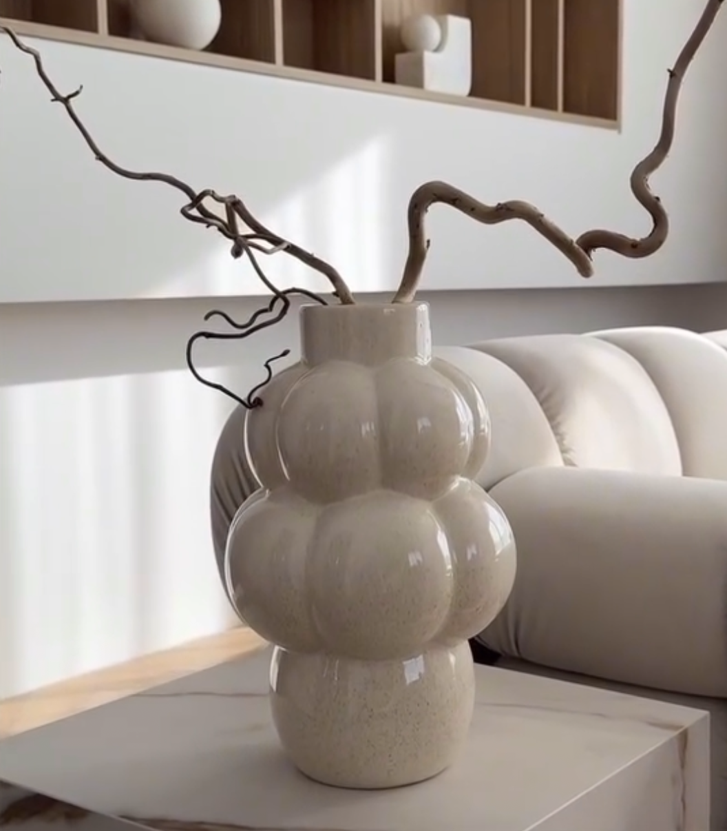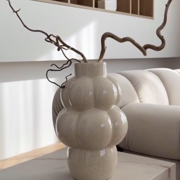 Tai šviesaus, glazūruoto paviršiaus keramikinė vaza su išraiškinga, burbuliuotą debesį primenančia forma. Jos minkštos, apvalios linijos ir subtilus blizgesys suteikia interjeriI žaismingumo bei modernios elegancijos.