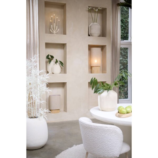 Ši išskirtinė keraminė žvakidė – tai subtilaus dizaino ir jaukios atmosferos derinys. Organinių formų, švelniai išlenktas siluetas suteikia interjerui natūralumo ir elegancijos, o neutralus, smėlio atspalvis lengvai įsilieja į įvairius namų stilius.
