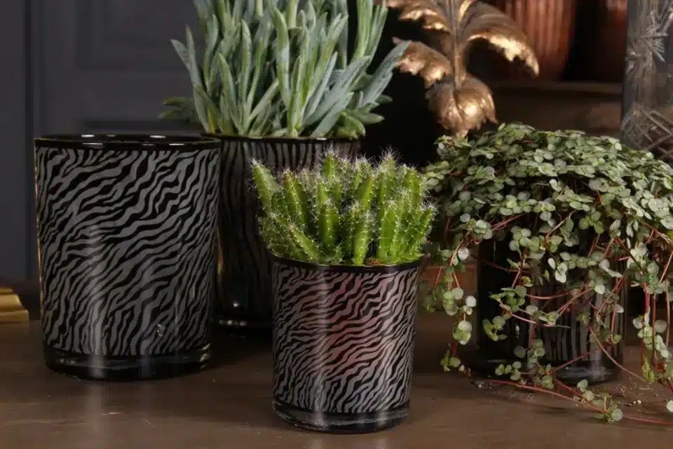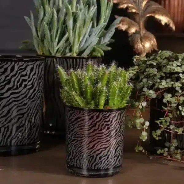 Arbatinės žvakės – puikus būdas sukurti jaukią atmosferą namuose ar net lauke. Šiose žvakidėse deginamos žvakės meta žaismingus šešėlius, kas prideda dar jaukumo. Taip pat galima naudoti kaip mažą vazą nedideliems augaliukams. Žvakidės-vazonėliai pagaminti iš stiklo ir turi unikalų zebro atspaudą. Supakuoti dailiose dėžutėse, tad puikiai tinka kaip smulki dovana.