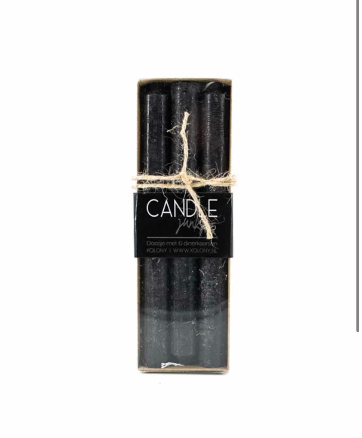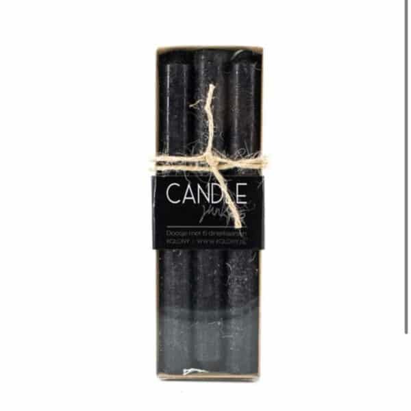 Juodų žvakių rinkinys, stilingoje pakuotėje! Vienos žvakės degimo laikas +/- 8 valandos. Žvakės modernaus dizaino, tarsi sendintos spalvos, 20 cm ilgio.