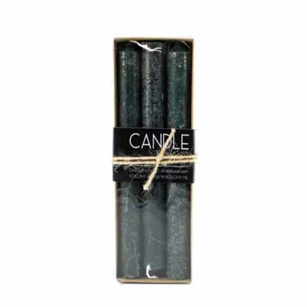Tamsiai žalių žvakių rinkinys, stilingoje pakuotėje! Vienos žvakės degimo laikas +/- 8 valandos. Žvakės modernaus dizaino, tarsi sendintos spalvos, 20 cm ilgio.
